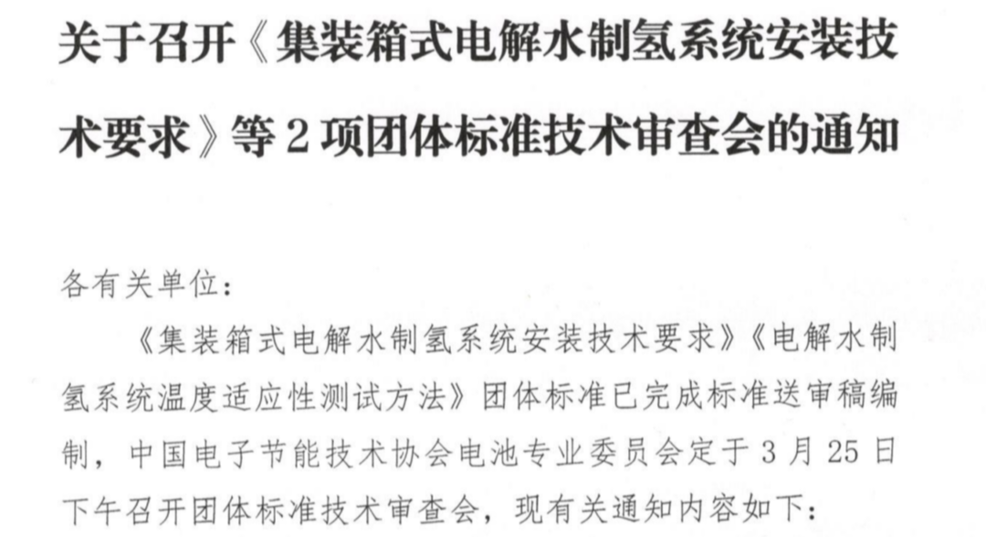 集装箱式电解水制氢系统安装技术要求》等2项团体标准技术审查会即将召开