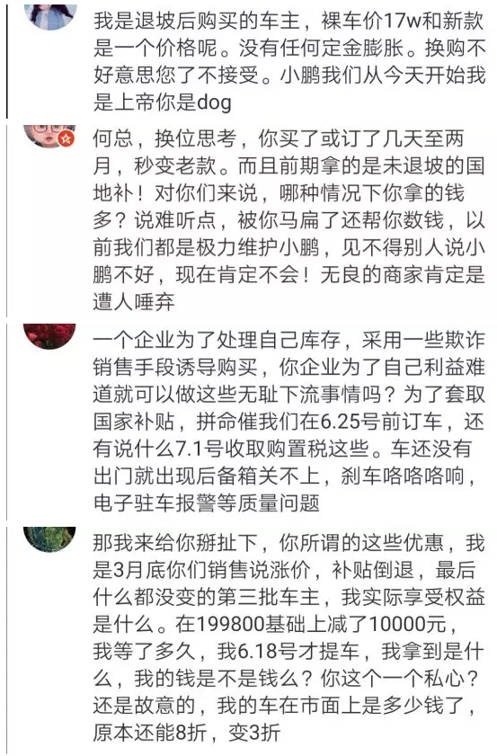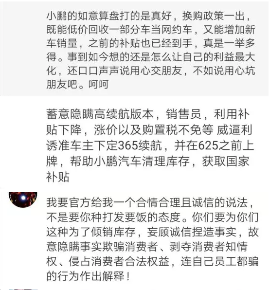 部分车主表示,在购车时小鹏汽车销售以补贴退坡马上涨价为由诱骗车主买车,但最后不仅没有涨价反而出了续航里程和价格都更为优秀的新款,车主认为小鹏汽车这种不告知买家升级换代,欺骗买家清库存行为完全就是欺诈。