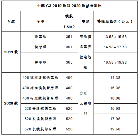 小鹏汽车于7月10号发布的新车因为售价和性能方面引起了大部分2019款G3买家的不满和愤怒。据了解,最新发布的2020款G3电池采用宁德时代新一代方形三元锂电池,续航里程分为400和520公里两款,综合补贴后全国统一零售价为14.38-19.98万元。