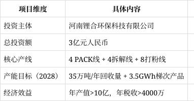 项目背景 2025年8月13日,湖北天门市政府与河南锂合环保科技有限公司签署协议,落地总投资3亿元的动力锂离子电池综合利用项目。该公司专注电池回收全链条服务,目前已在全国布局20个项目、100个区域回收仓,天门项目是其华中核心枢纽 。 产线与产能规划 项目将建设: