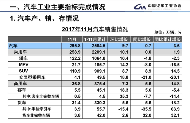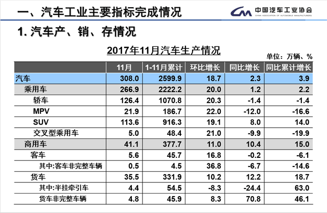 中汽协数据显示,今年11月,我国汽车生产308.03万辆,环比增长18.69%,同比增长2.31%;销售295.76万辆,环比增长9.73%,同比增长0.65%,创下月度销量新高。虽然11月销量表现惊人,但由于去年11月和12月的产销数量很高,导致今年11月同比增长幅度很低,从而影响了整体的增速。1~11月,汽车产销2599.88万辆和2584.49万辆,同比增长3.88%和3.59%,增速比1~10月减缓0.39个百分点和0.54个百分点,许海东预计今年的增速将有可能低于4%。