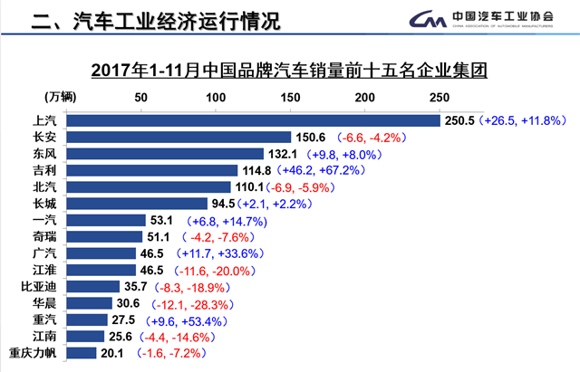 1~11月,汽车销量排名前十位的企业依次是:上汽、东风、一汽、长安、北汽、广汽、吉利、长城、华晨和奇瑞。其中销量超过100万的有5家,与上年同期相比,吉利和广汽销量呈两位数较快增长,上汽、一汽和长城增速略低,其他五家企业有所下降。1~11月,上述十家企业共销售2290.97万辆,占汽车销售总量的88.64%。另外,今年1~11月我国汽车品牌的市场份额达到43.4%,与去年的42.7%相比略微有增加。值得注意的是,韩系汽车品牌的市场占有率大幅下跌,从去年的7.2%下降到今年的4.4%。